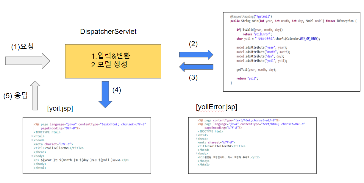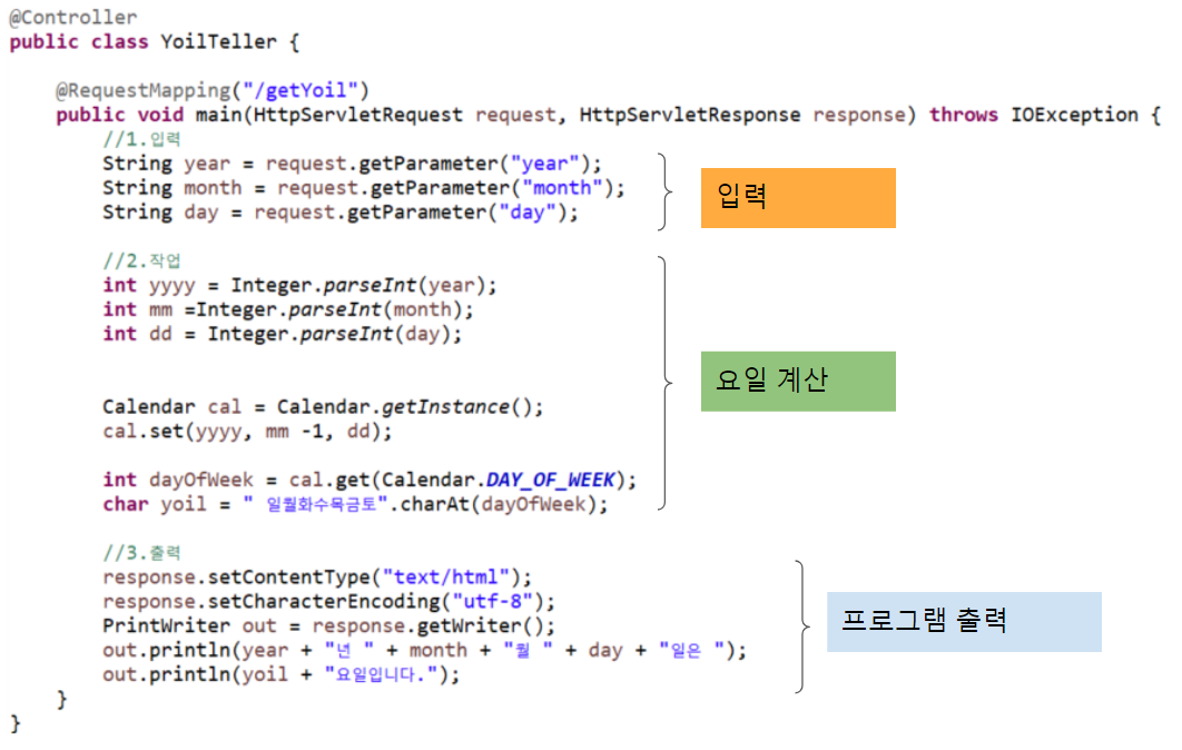 위의 코드는 요일 계산을 코드다. 코드는 크게 입력, 요일 계산, 프로그램(코드) 출력 세 부분으로 나뉜다. 객체지향 설계(OOP설계)의 첫 번째 원칙은 '하나의 메서드는 하나의 책임' 단일책임원칙(SRP)다. 스프링 MVC는 단일 책임에 따라 작성하는 방법론이다. 따라서 위 코드를 MVC 패턴에 따라 작성하면 단일책임원칙에 따라 작성하게 된다.