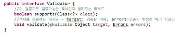 객체를 검증하기 위한 인터페이스로 객체 검증기(validator)구현에 사용된다.