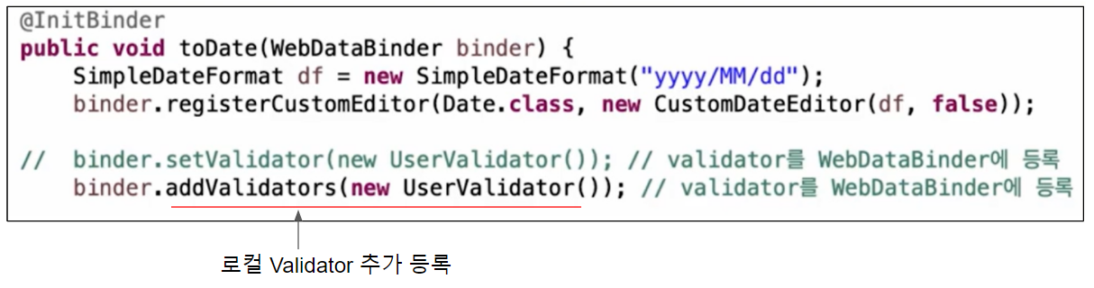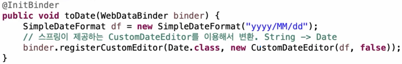 - 특정 컨트롤러 내에서 변환 할 때 - 컨트롤러에 @InitBinder가 붙은 메서드를 작성한다.