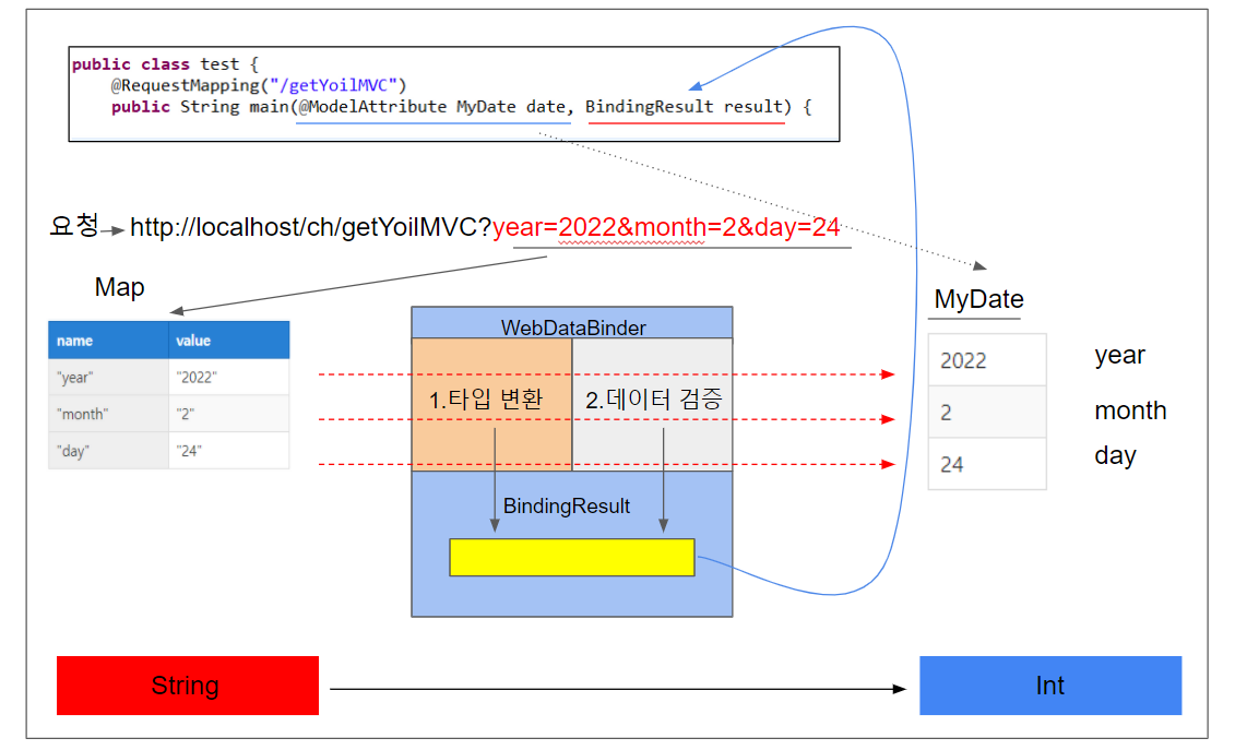 Map담긴 데이터의 타입은 String이다 하지만 MyDate에 담긴 데이터의 타입은 Int다. Map에 담긴 데이터가 MyDate에 담기기 위해선 Int 타입으로 변경 해야하는데 스프링에서는 WebDataBinder를 통해 타입 변환을 시킨다. 타입이 변환되면 에러, 결과값을 BindingResult에 저장한다.