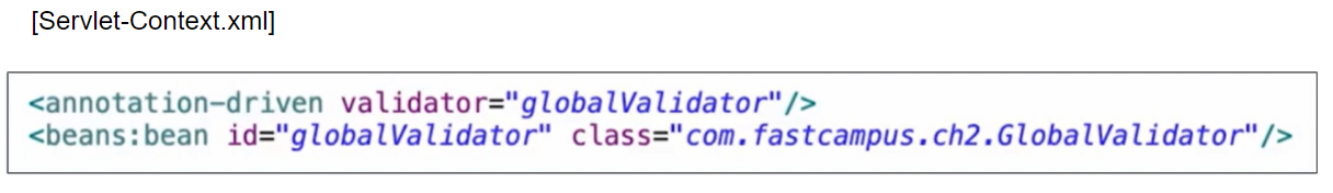 글로벌 Validator를 사용 하기 위해선 Servlet-Context.xml에 들어가서 위의 그림과 같이 Bean과 annotation-driven을 입력해준다. 그러면 어떤 객체에서든 @Valied를 통해 검증가능하다.