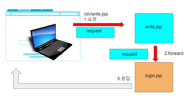 forward는 redirect와 달리 요청이 한번만 발생한다. 브라우저로부터 요청을 받으면 잘못된 위치로 요청받았기 때문에 요청받은 write.jsp는 다른 위치로 연결(forward)을 해준다. forward는 카드사 대표전화에 분실신고로 전화하면 대표전화는 담당이 아니기 때문에 분실신고 센터로 자동 연결해주는 것과 같은 이치다.