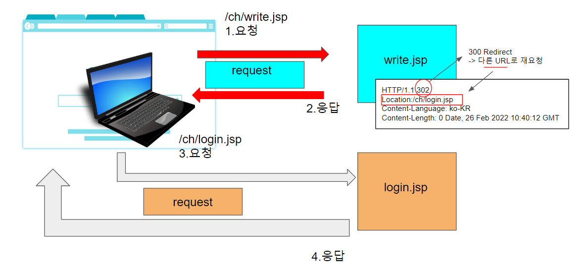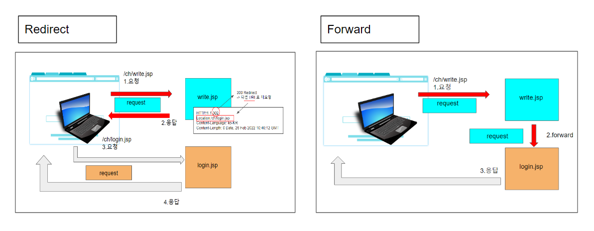 redirect는 브라우저에서 받은 요청을 다른 URL로 재요청한다. 브라우저에서 1.요청을 하면(수동, GET/POST둘다 가능) 헤더에서는 302 즉 다른 URL로 재요청하는 300 Redriect가 입력되고 다른 URL로 요청되는 위치를 Location에 쓰여진다. 2.응답을 받은 브라우저는 새로운 위치(login.jsp)로 3.요청 재요청(자동, GET만 가능)하게 된다. 요청후에 작업이 완료된 login.jsp에서 브라우저로 응답한다. redirect는 요청이 두 번 발생한다. request가 두 번 발생하는 데 두 request는 다르다.