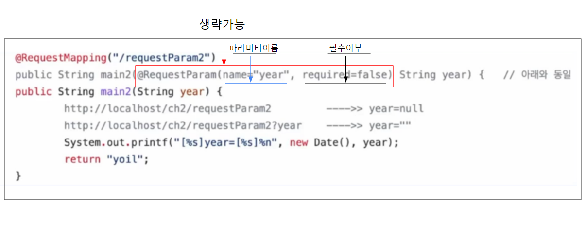 @RequestParam은 요청의 파라미터를 연결할 매개변수에 붙이는 애너테이션이다. @RequestParam이 쓰이는 경우를 살펴보자.