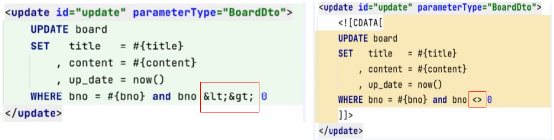 XML 내의 특수 문자(<>, &, ...)는 < >로 변환 해야한다. 그런데 일일이 특수문자 대체하는 문자를 써준다면, 헷갈리고 효율적이지 못하다. 그래서 <![CDATA[와 ]]>로 감싼다. 그러면 위의 그림 오른쪽 이미지와 같이 CDATA로 감싸서 특수문자를 써준다면 효율적이다.
