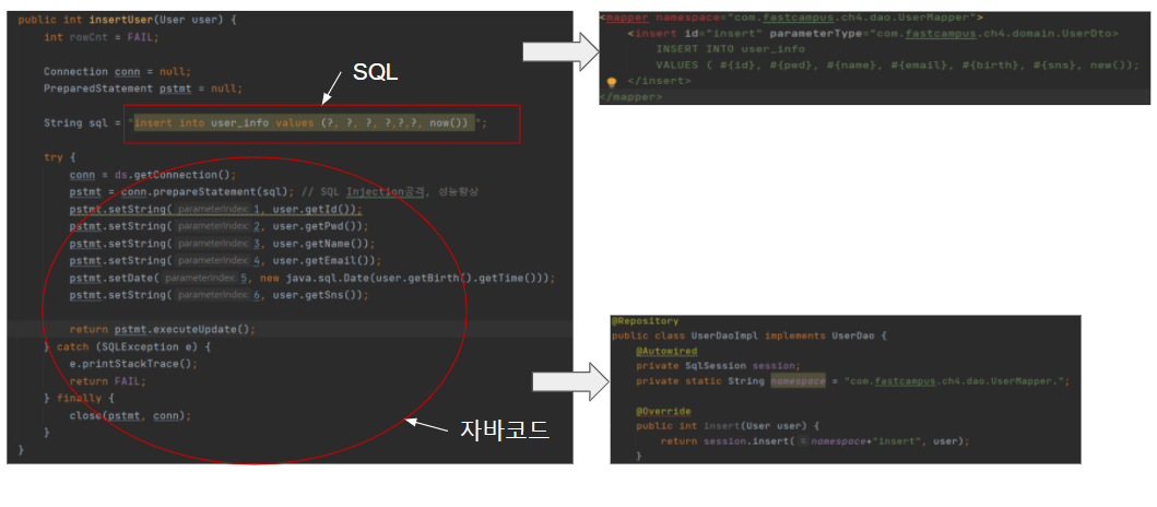 MyBatis로 DAO를 작성할 때는 1.DB테이블 생성 -> 2.Mapper XML과 DTO작성 ->3.DAO인터페이스 작성 ->4.DAO인터페이스 구현과 테스트의 순서로 진행된다. 구현하는 코드와 매퍼는 서로 상응되고 상응되는 코드는 그림에서 화살표로 표시해두었다.