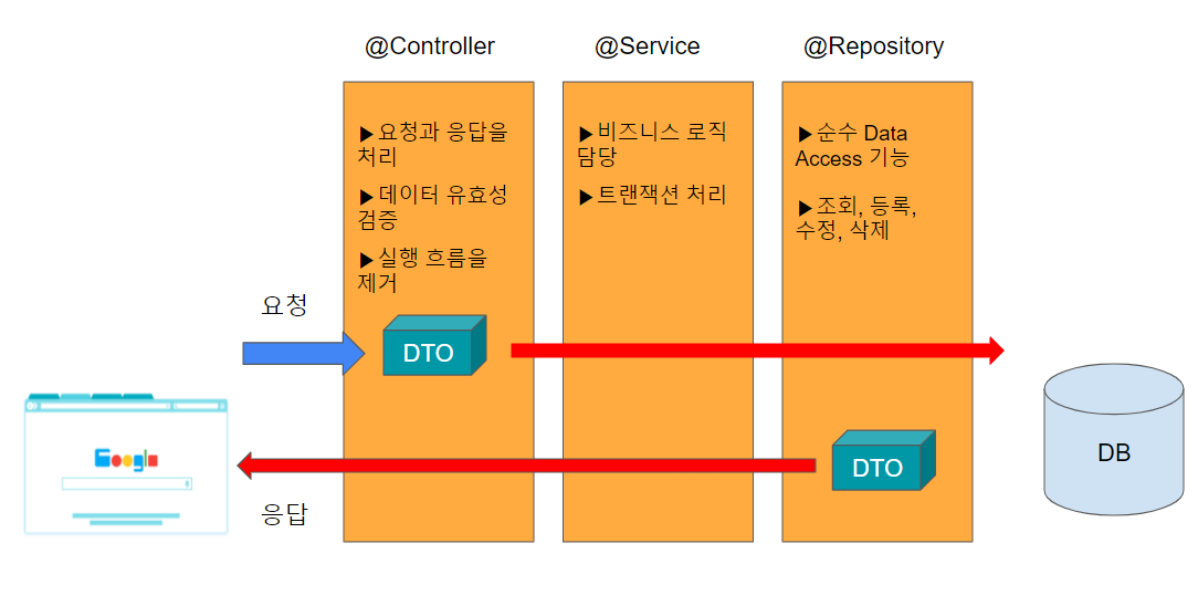 DTO는 계층간의 데이터를 주고 받기 위해 사용되는 객체다. 쉽게 설명하면 자료를 담는 바구니라고 말할 수 있고, Spring의 MVC패턴에서 자료값을 담는 Model과 기능이 유사하다. 브라우저에서 값을 꺼낼 때 ①의 과정을 거쳐 DB의 값이 DTO에 저장된다. 만약 값을 꺼내는 것이 아니라 브라우저에서 요청된 값을 DB에 저장한다면, ②의 과정을 거쳐 브라우저를 통해 DTO에 입력된 값이 DB에 저장된다.