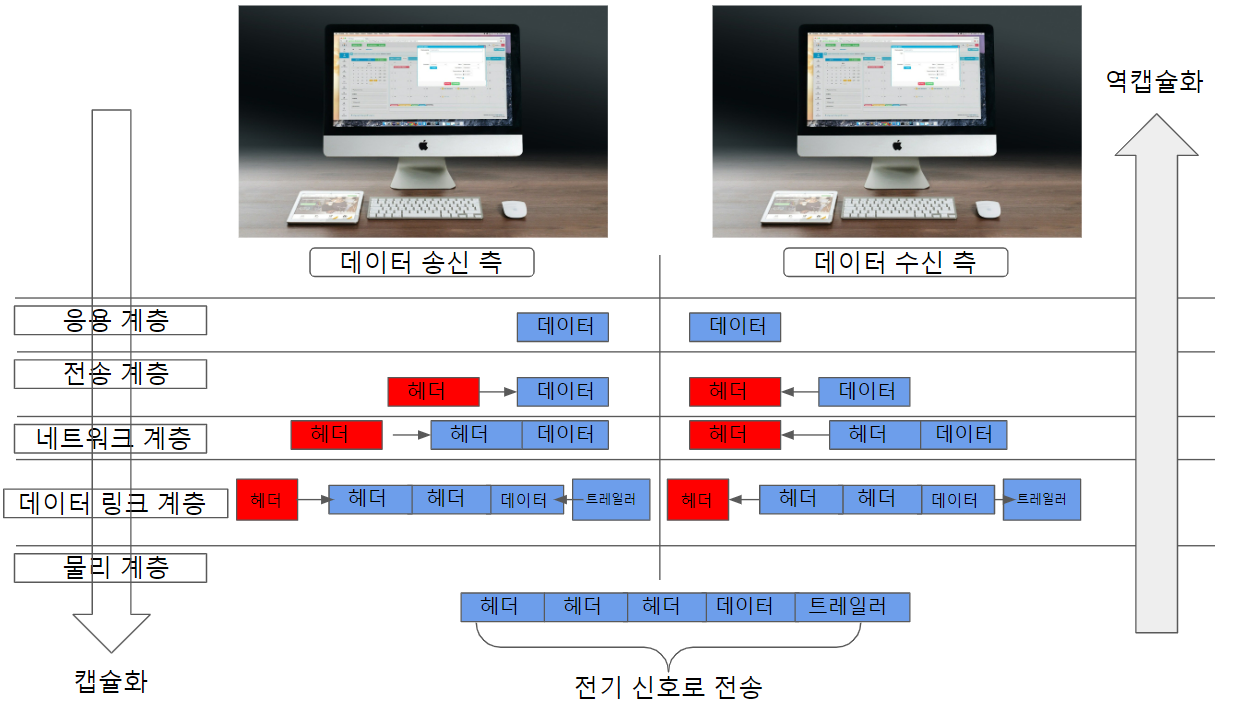 컴퓨터 A에서 컴퓨터 B로 데이터를 보내면 송신 데이터 앞부분에 헤더를 붙여야 한다. 헤더는 송신 데이터가 어떤 정보를 가지고 있는지 나타내며 데이터를 전달받을 상대한 정보도 포함되어 있다. 이처럼 헤더를 붙여 나가는 걸 캡슐화라고 한다. 반대로 헤더를 제거 해나가는 작업을 역캡슐화라고 한다.