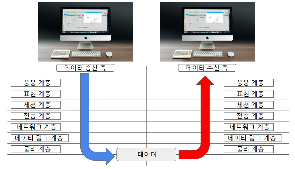 데이터를 보내면 데이터를 보내는 쪽(송신 측)에서 상위 계층에서 하위 계층으로 데이터를 전달한다. 각 계층은 독립적이므로 다른 계층의 영향을 받지 않는다. 반대로 데이터를 받는 쪽(수신 측)에서는 하위 게층에서 상위 계층으로 데이터가 전달된다.