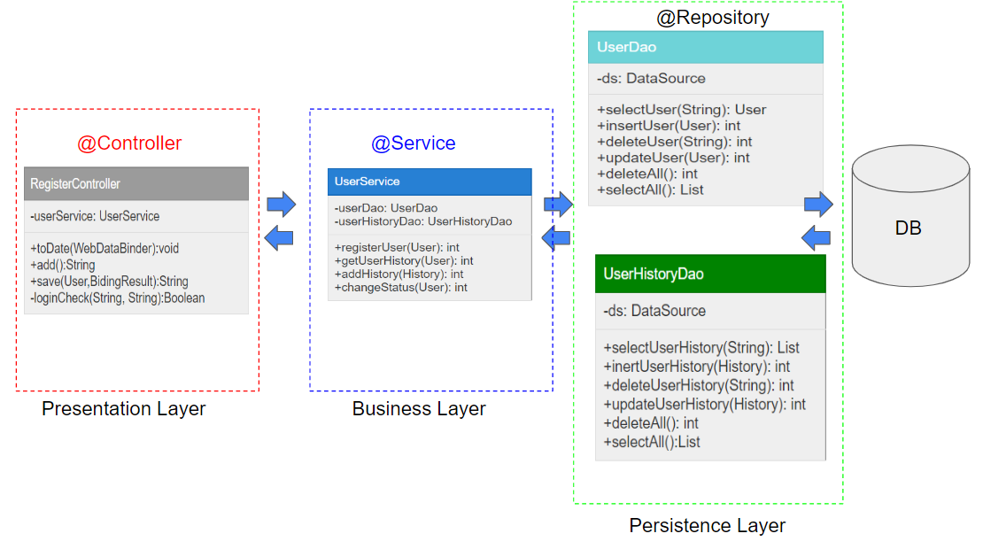 UserHistoryDao 회원의 이력을 추가, 삭제, 수정 등 비즈니스 로직을 수행하는 역할이 필요하다. Persistence Layer인 UserDao는 단순히 DB테이블의 정보를 CRUD(Creadt, Remove, Update, Delete)하는 기능만 수행하기에 비즈니스 수행할 수 없다. 그래서 Presentation Layer인 RegisterController에게 UserHistoryDao를 주입해서 사용했다. 하지만 Presentation Layer는 흐름을 제어하는 계층이지 비즈니스 로직을 관리하는 계층이 아니다. 그래서 비즈니스 로직을 담당하는 Business Layer를 새로 만들어 관심을 분리시킨다.
