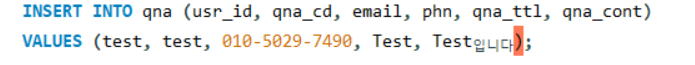 INSERT INTO qna (qna_cd, email, phn, qna_ttl, qna_cont) VALUES (1, test, 010-5029-7490, Test, Test입니다) Error Code: 1054. Unknown column 'test' in 'field list' 0.031 sec