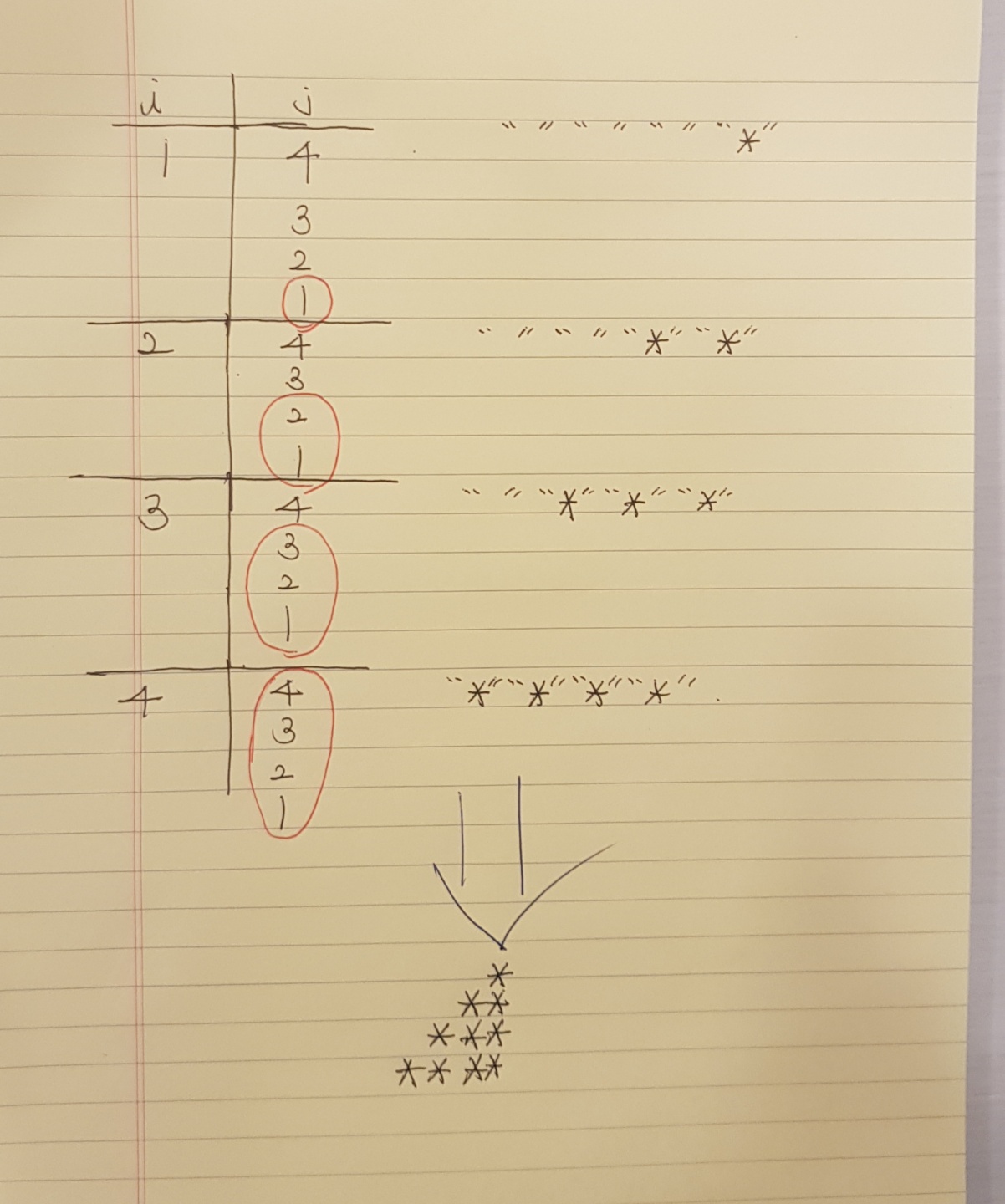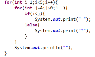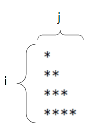 위의 별찍기와 모양은 똑같지만 반대의 방향의 별이다. 위의 별 찍기를 수행할 수 있다면 다음 별찍기는 더 수월하게 풀 수 있다. 앞의 방법과 같이 별의 모양을 i와 j로 표현해보면 i와 j의 수가 같아질 때 까지 별이 찍히는 걸 알 수 있다. 이를 코드로 표현해본다면 아래와 같다. i와 j의 수가 같아지기 전까지 별을 찍는 수식을 표현한게 흥미롭다.