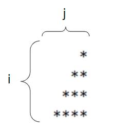 문제를 간단히 보기위해 세로를 'i'로 가로를 'j'로 놔두자. 그러면 i의 수가 증가할수록 j의 공백은 감소하고 별은 증가하는 걸 알 수 있다. 이를 코드로 나타낸다면 아래와 같다. 코드를 보면 바깥쪽 for문이 실행되면 안쪽의 for문은 조건에 따라 공백을 쓰기도 별을 찍기도 한다. 여기서 포인트는 안의 for문에서 '조건이 변하는 때'인데 조건을 보면 i의 값이 j의 값보다 커질 때 조건이 변화되는 걸 알 수 있다.