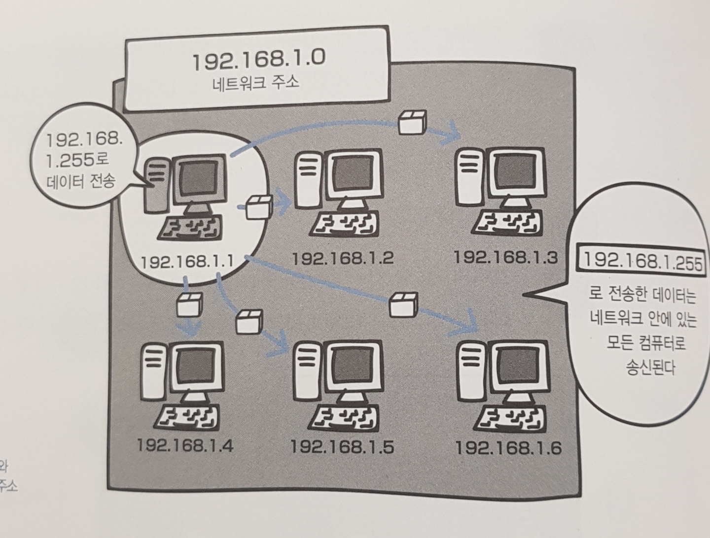 - 브로드캐스트(broadcast): IP 네트워크에 있는 모든 컴퓨터(호스트)로 데이터를 전송하는 방식.