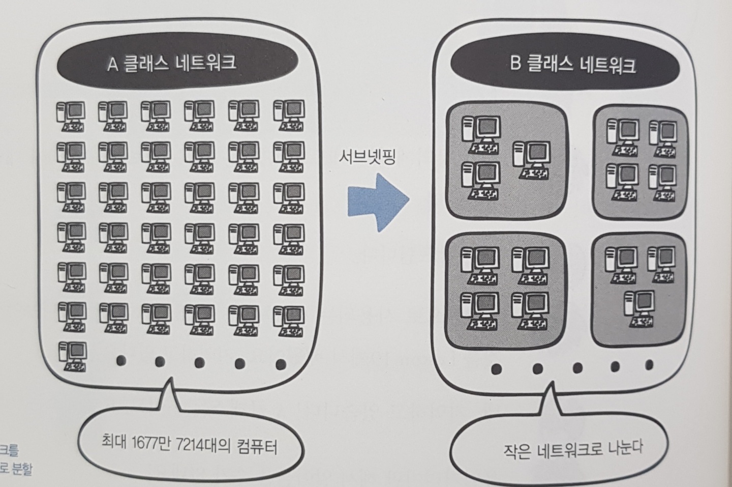 IP주소는 A,B,C 클래스로 나누어져 있다. A클래스는 네트워크 ID가 8비트에 호스트 ID가 24비트고, B 클래스는 네트워크 ID가 16비트에 호스트 ID가 16다. C와 D클래스도 마찬가지로 네트워크 ID와 호스트 ID가 나뉜다. 이렇게 하나의 네트워크에서는 수많은 주소를 사용한다. 그런데 많은 수의 컴퓨터가 브래드캐스트 패킷을 전송하면 모든 컴퓨터에 패킷이 전송되고 네트워크가 혼잡해지는 문제가 생긴다. 그래서 대규모 네트워크를 분할하여 브로드캐스트로 전송되는 패킷의 범위를 줄 일 수 있는데, 이처럼 네트워크를 분할하는 것을 서브넷팅(subneting)이라하고 분할된 네트워크를 서브넷(subnet)이라 한다.