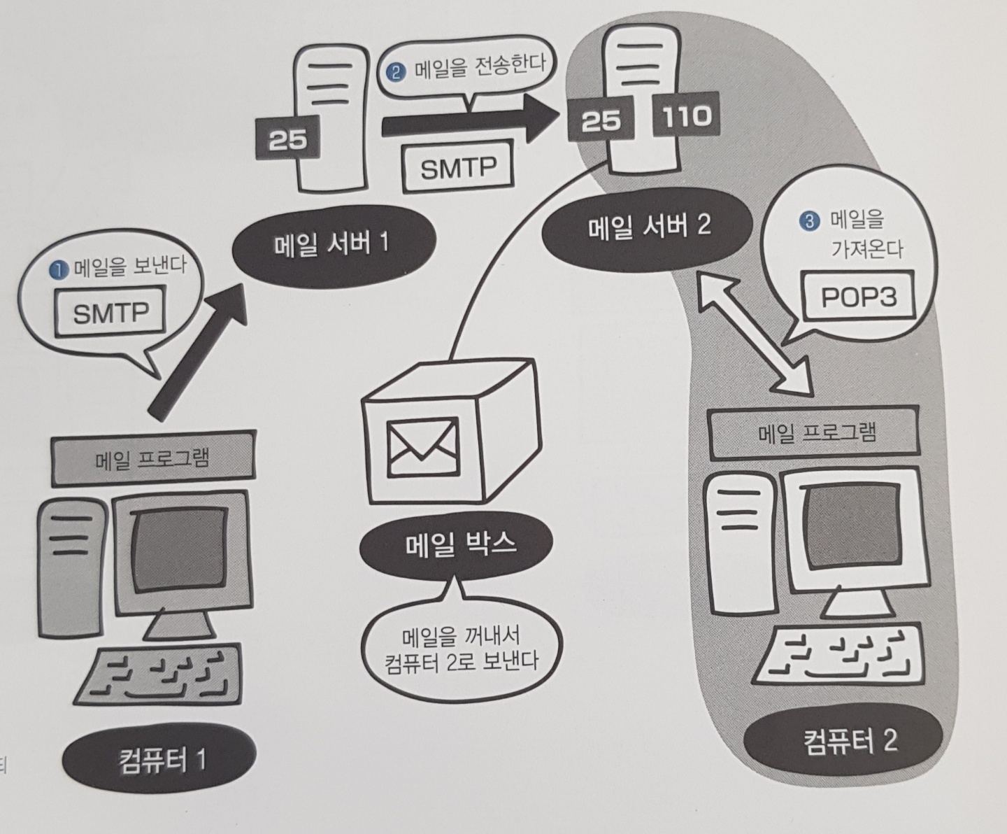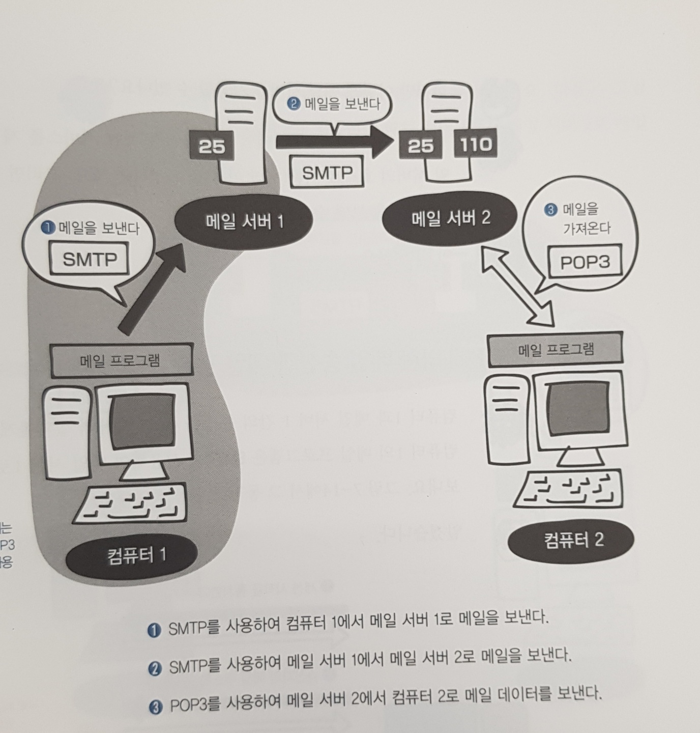 - POP3: 인터넷에서 메일을 수신하는 데 사용하는 프로토콜이다. 통신 포트는 일반적으로 110번을 사용한다. POP3를 지원하는 서버를 POP3 서버라고 한다.