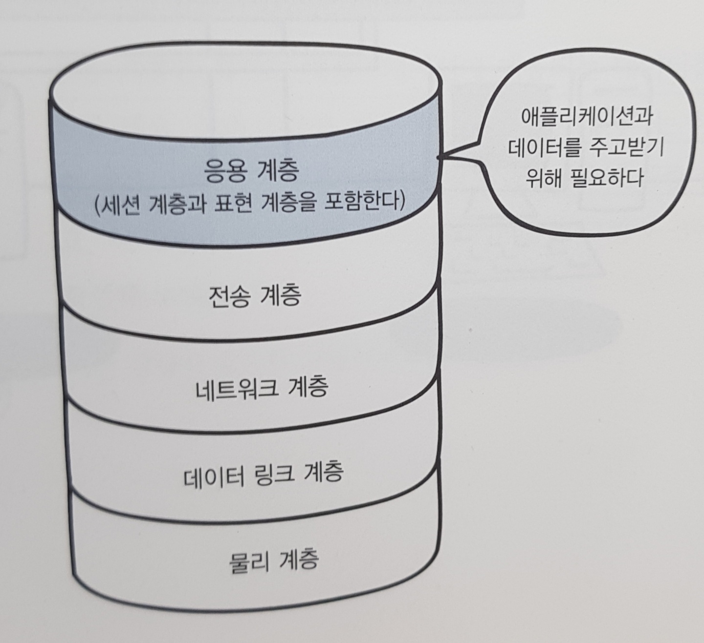 - 응용 계층(application layer, 애플리케이션 계층) : OSI 모델의 최상위 계층으로 다양하게 존재하는 응용 환경에서 공통적으로 필요한 기능을 다룬다. 시스템 간의 응용 처리는 상호 간에 통신하면서 일련의 업무를 처리할 수 있도록 필요한 서비스 기능을 제공한다. 이메일, 파일 전송, 웹사이트 조회 등 애플리케이션에 대한 서비스를 제공하는 계층.