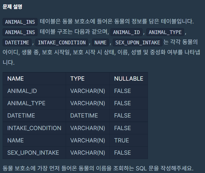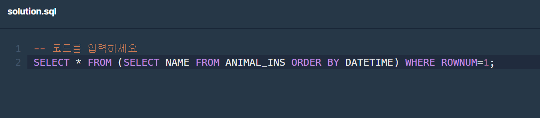 내가 틀린 이유: '동물 보호소에 들어온 동물 중 가장 먼저 들어온 동물의 이름 조회' 조건 SQL문으로 표현 못했다. FROM절에 서브쿼리를 넣고 ROWNUM을 이용해 조건을 충족 시킬 수 있을지 상상도 못했다.