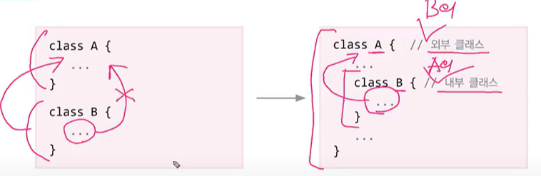①내부 클래스에서 외부 클래스의 멤버에 쉽게 접근할 수 있다. 즉 내부 클래스에서 객체 생성 없이도 A의 멤버에 접근이 가능하다.