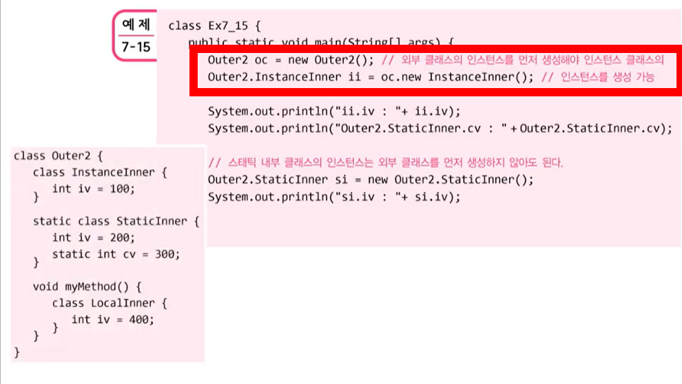 - 내부 클래스를 외부에서 사용하기 위해선 외부 클래스를 먼저 생성하고 내부 클래스를 생성하여 사용한다.