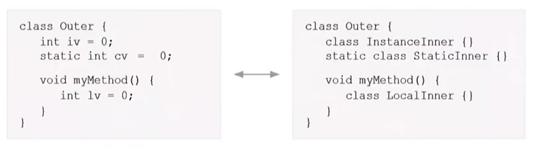 내부 클래스의 종류와 유효범위는 변수와 동일하다.