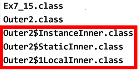 - 출력 결과에서 내부 클래스 앞에 '$'표시와 함께 외부 클래스가 붙는