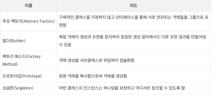 :객체의 생성과 관련된 패턴이다. 객체의 인스턴스 과정을 추상화하는 방법이다. 객체의 생성과 참조 과정을 캡슐화하여 객체가 생성되거나 변경되어도 프로그램 구조에 영향을 받지 않도록 하여 프로그램에 유연성을 더해준다. 생성 클래스 패턴은 객체를 생성하는 일부를 서브 클래스가 담당하도록 하며, 생성 객체 패턴은 객체 생성을 다른 객체에게 위임한다.