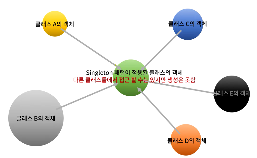 - 싱글톤이 사용되는 클래스의 인스턴스가 하나만 만들어지고, 어디서든 그 인스턴스에 접근할 수 있도록 만든 패턴