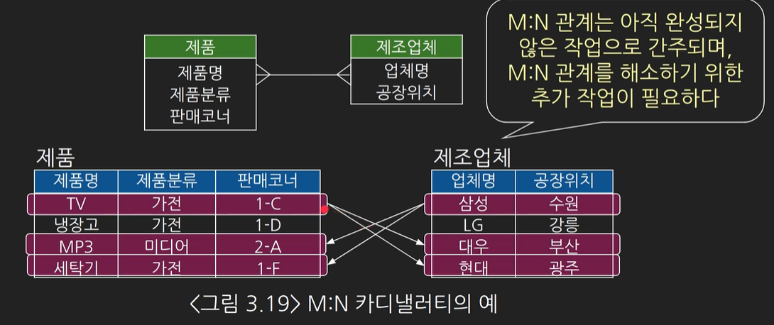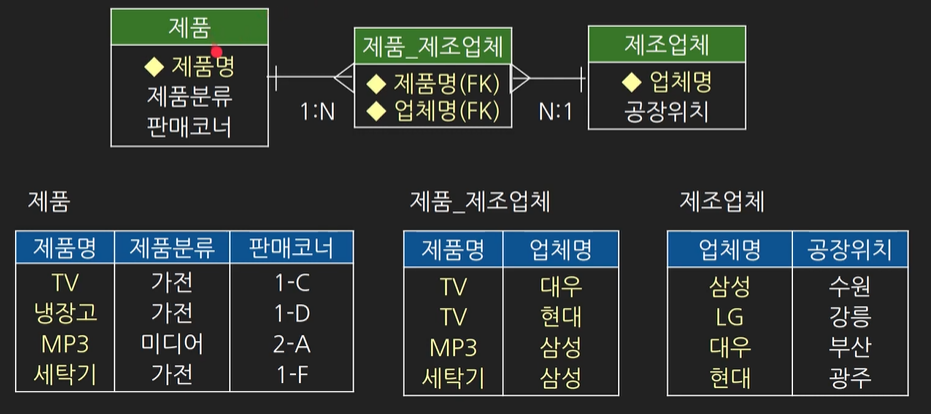 제조업체 엔티티 입장에서도 제품 엔티티와 1:N관계를 가진다. 삼성, LG, 애플은 각기 다른 컴퓨터, 냉장고, 세탁기를 가질 수 있어 1:N관계를 형성한다. 하지만 M:N은 완성되지 않은 작업이다. 즉, 엔티티의 관계만을 나타내기 때문에 구체적으로 한 엔티티의 요소가 다른 엔티티의 요소와 관계 되어있는 지 알 수 없다. 아래 표를 예로 들면, 어느 제조업체가 어느 제품을 만드는 지 알지 못한다.(반대도 마찬가지다.) 이 문제를 해결하기위해 추가적인 작업을 해줘야 한다.