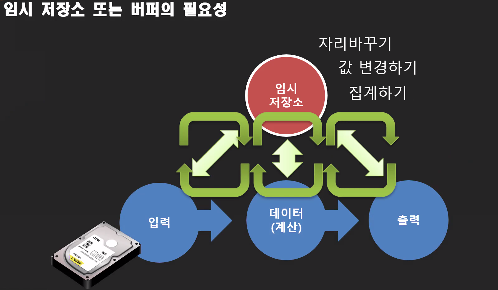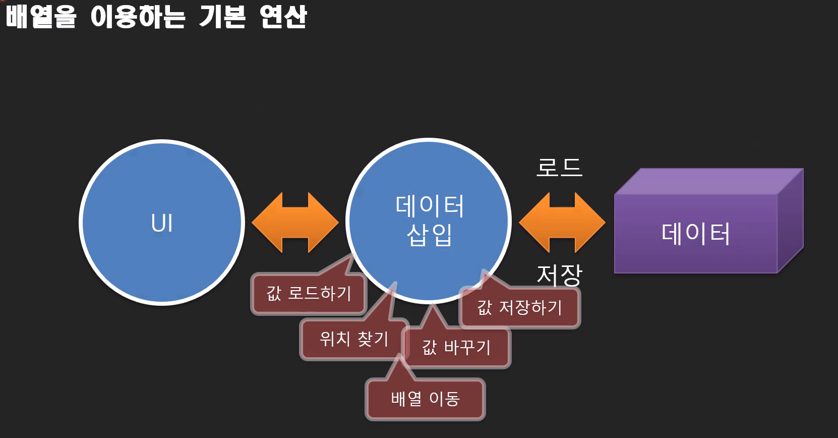 배열은 하나의 값이 아니라 많은 값을 필요로하는 작업을 수행하기 위해 사용한다. 왜 데이터를 한꺼번에 모을까?? 하드디스크가 연속되게 값을 처리하는 작업을 수행하는 성격 때문이다. 이런 하드디스크의 문제를 해결하기 위해 데이터를 램에 담고 데이터 순서를 변경한다. 이런 일련의 작업을 수행하기 위해선 데이터를 담는 방 즉 배열이 필요하다. 배열은 큰 방을 마련하고 반복문(for문)과의 결합을 통해 코드 반복을 수행한다.
