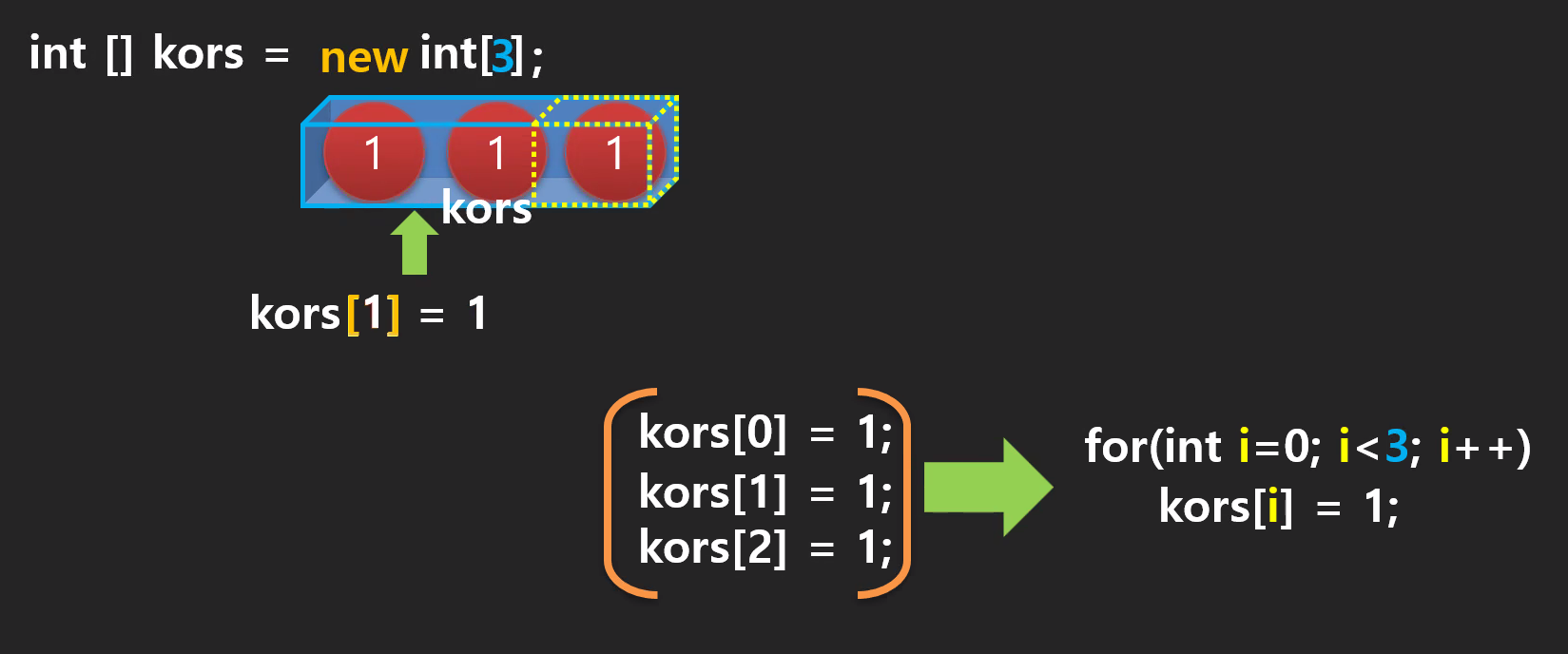 :kor[1]과 int kor은 동일한 공간을 가질까? 정답은 '그렇다'이다. int[] kors = new int[5]일 경우 데이터가 저장되는 배열 하나당 차지하는 공간의 크기는 4byte인데 int 변수도 4byte의 크기를 갖는다. 그래서 kor[1]와 int kor의 공간은 4byte로 같다.