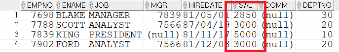 이번에는 반대로 30번 부서 사원들의 최소 급여(SAL=950)보다 많은 급여를 받는 사원의 정보를 출력해보자.